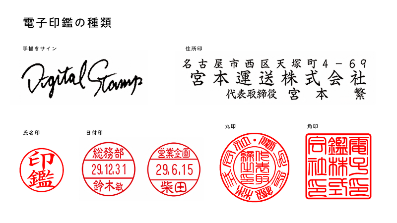 氏名印・日付印・役職印・角印など多くの印鑑を電子印鑑として使用できます。